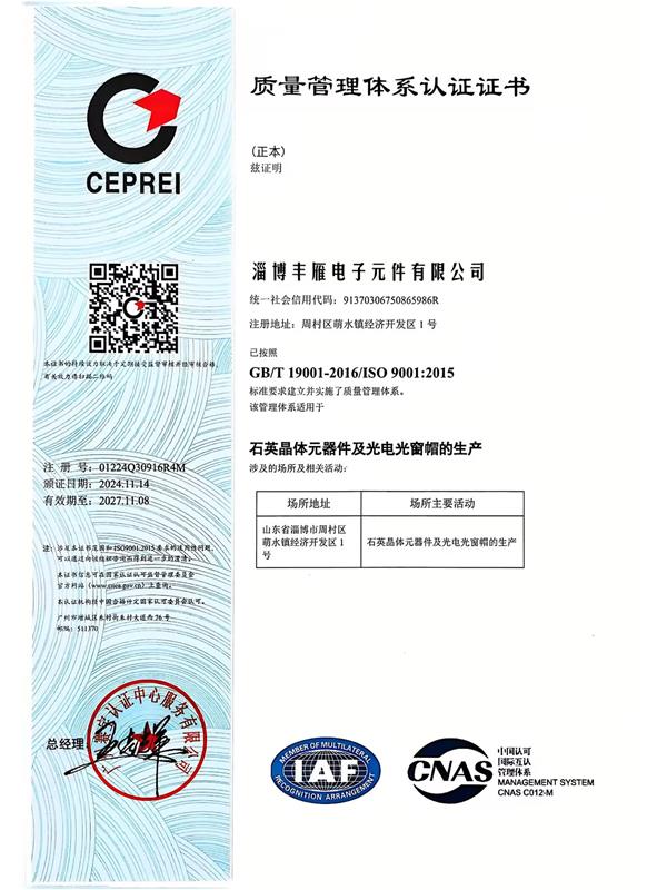 淄博豐雁電子元件有限公司,是一家集研發、生產、銷售為一體的透鏡管帽、晶體諧振器、晶體濾波器的高新技術企業。成立于1992年,坐落于山東省淄博市周村區,注冊資金1000萬元,擁有職工150余人,公司占地35000平方米,其中擁有5000平方的超凈化廠房,并配備了千級凈化工作臺,確保環境的凈化度。公司下設光電事業部,濾波器事業部,晶體事業部等多個事業部。專注為光通訊、激光器領域以及各種電子應用領域進行電子元件配套。公司于1999年通過了ISO9000質量體系認證,公司提供的所有產品符合歐盟的R0HS和REACH標準。公司被認定為淄博市“專精特新”企業、“淄博市企業技術中心”、省級“專精特新”企業、“山東省制造業單項冠軍”。公司擁有持續創新的研發團隊,有常年的外聘技術專家長期指導,并且與國內多所大學和光電研究所保持長期合作關系,確保了產品和技術的先進性,能持續為客戶提供高質量的產品和更好的全方位服務。